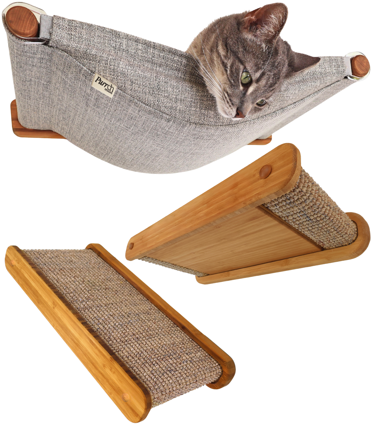 Our most popular kit. The ideal entry point into the Play Series cat furniture. Two sturdy, sisal-wrapped shelves plus a hammock create the perfect vertical space - stylish, space-saving, and easy to install with our patent-pending single-screw mounts.